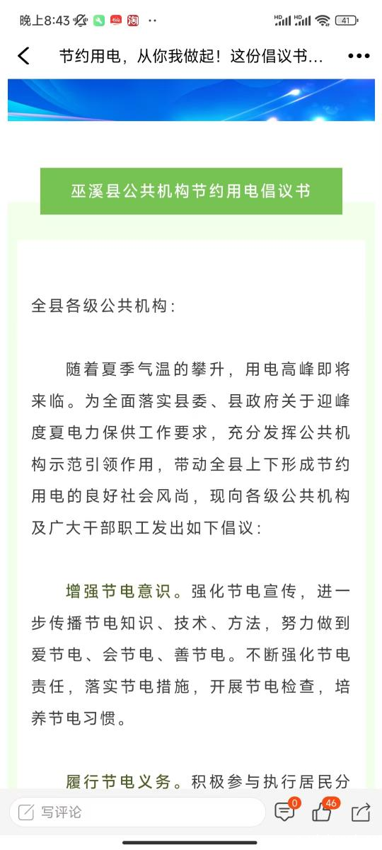 通过“巫溪APP”等本地媒体平台推送“节约用电倡议书”,各公共机构利用宣传栏、工作群广泛宣传节约用电的相关政策要求,带头落实有序用电、节约用电的相关规定。