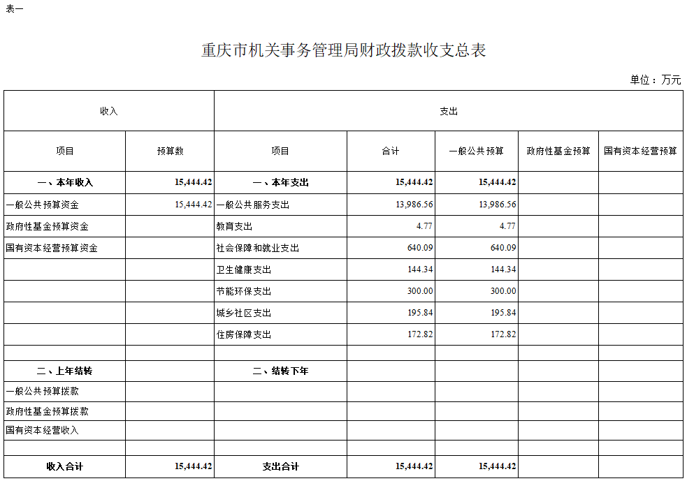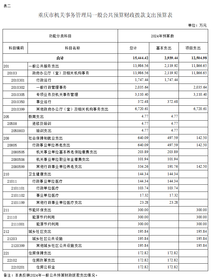 2024年一般公共预算财政拨款收入15444.42万元,一般公共预算财政拨款支出15444.42万元,比2023年减少1680.19万元。其中:基本支出2939.44万元,比2023年减少0.35万元,主要原因是在职人员减少,主要用于保障在职人员工资福利及社会保险缴费、退休人员补助等,保障部门正常运转的各项商品服务支出;项目支出12504.98万元,比2023年减少1679.84万元,主要原因一是2024年减少信息化运维项目,二是2024年减少一般公共预算项目拨款上年结转,主要用于部分市级机关集中办公场所后勤保障、党政机关统一更新购置公务用车、党政机关办公用房管理等重点工作。